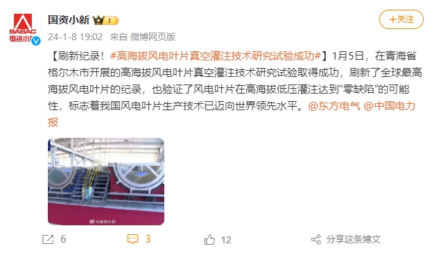 [国资小新]刷新纪录!#高海拔风电叶片真空灌注技术研究试验成功#